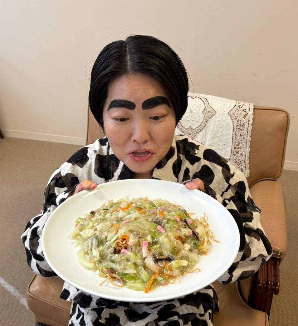 イモト:その日、私とマネージャーとヘアメイクさんの3人いたんですよ。だから、3人用で大皿を用意してくださったのかなと思ったら、「1人前です」って言われて。これで1人前!?3人いるからこの量かな!?と思ったら、通常がこの1人前で。ウソでしょ~!?と思って。最初、これは食べられない・・・と思ってたんですけど、食べ始めてみたら、まあ食べられる! 出汁の効いた餡のやさしい味で、麺もあるけど、けっこうお野菜がたっぷりだからガンガンいけちゃうんですよね! 本番前にペロリでしたよ。
