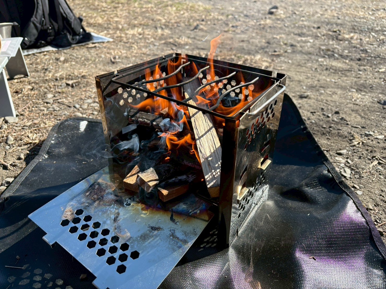 ▼焚き火シート、焚き火台など設置して、薪を組んで、10分ほどで、火がつき始める