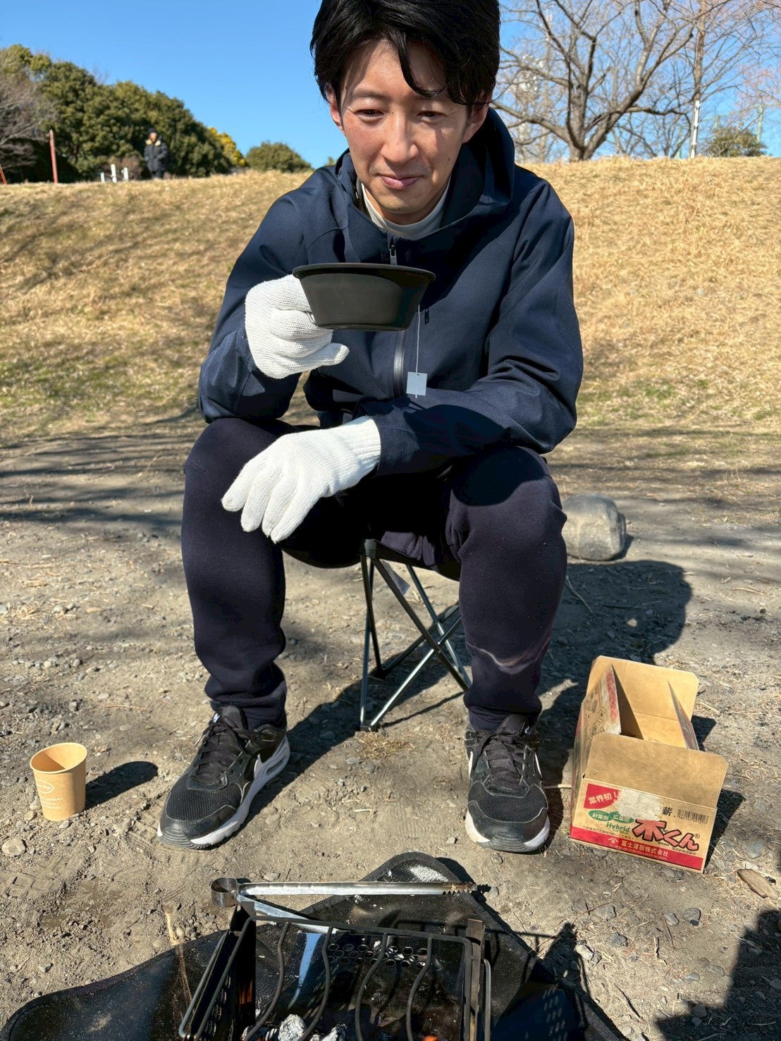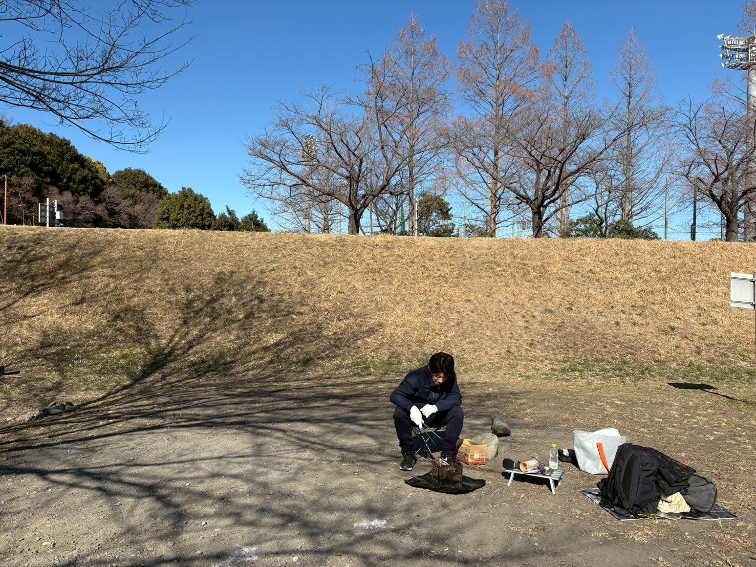 杉山: 東京の府中市にやってまいりました。府中駅から車で10分ぐらいですね。「府中市 郷土の森公園」です。河川敷沿いに無料のバーベキュースポットがあります。予約がいらないということで、朝、生放送が終わってやってきたんですけど。1、2、3、4組、5組……平日の昼間ですが、私たち以外にも5組ぐらいの方が今、火を起こしてます。1人で焚き火を、バーベキューをしてる方もいらっしゃるようですね。私も今からここで焚き火を起こしたいと思います!