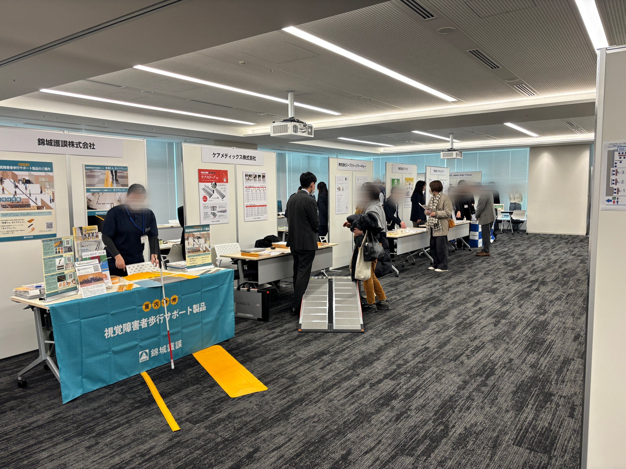 錦城護謨では視覚障害者の歩行をサポートする製品を3種類取り扱っております。いずれも屋内専用のもので、点字ブロックのつきにくい場所の道しるべになるようなもの。メインで出展しているのは「歩導くんガイドウェイ」で製品の外周部分がスロープになっているゴム製のマットでございます。例えば点字ブロックが足りないところを増やしていったり、何もないところに誘導の動線としてつけていただくことができるような製品になってます。一番の特徴は表面がでこぼこしていないので、車いすや、ベビーカー、荷物運ぶ台車等も通りやすくなっております。